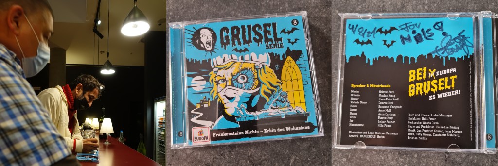 Nach dem Film haben wir den Abend gemütlich in der Kinobar ausklingen lassen. Bei Snacks und Getränken hatte man die Chance, einmal die Menschen hinter den Kulissen persönlich kennenzulernen und auch ein paar Worte zu wechseln. So habe ich es mir nicht nehmen lassen, mir mein Exemplar von Frankensteins Nichte von Hörspielautor André Minninger signieren zu lassen.