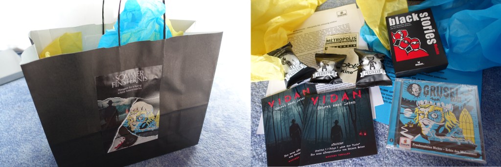 Für jeden Gruselfan gab es zum Abscheid auch noch eine Überraschungstüte. Darin waren 2 Gutscheine fürs Metropolis-Kino, eine black stories Spiel (die Medizin Edition), ein paar „Pechkekse“, die erste Folge von „VIDAN“ und zu guter Letzt die aktuelle Grusel-Folge Frankensteins Nichte als CD.